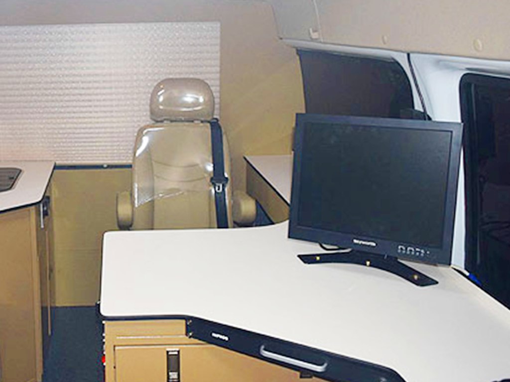 勘察车采用全顺系列客车底盘,依据GA/T 799-2008《现场勘查车技术条件》设计而成,整车集现场勘查、取证、专网通讯、移动办公、数据传输、现场实时图像监控、强光照明、供电及现场勘查等功能于一体的多功能警务用车。主要功能包含现场保护、勘查